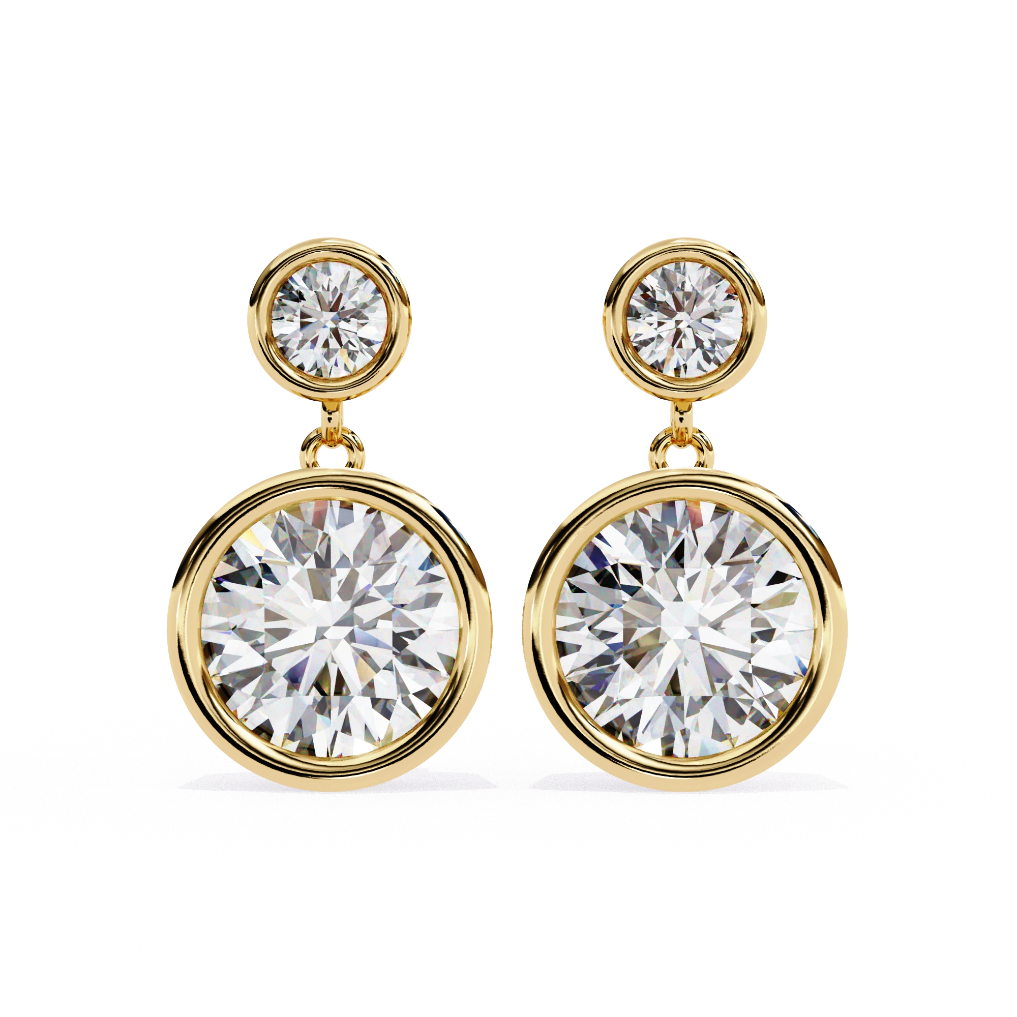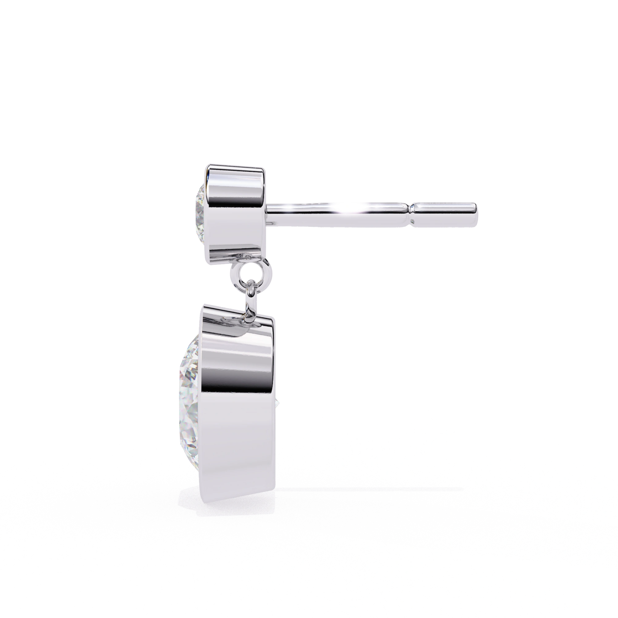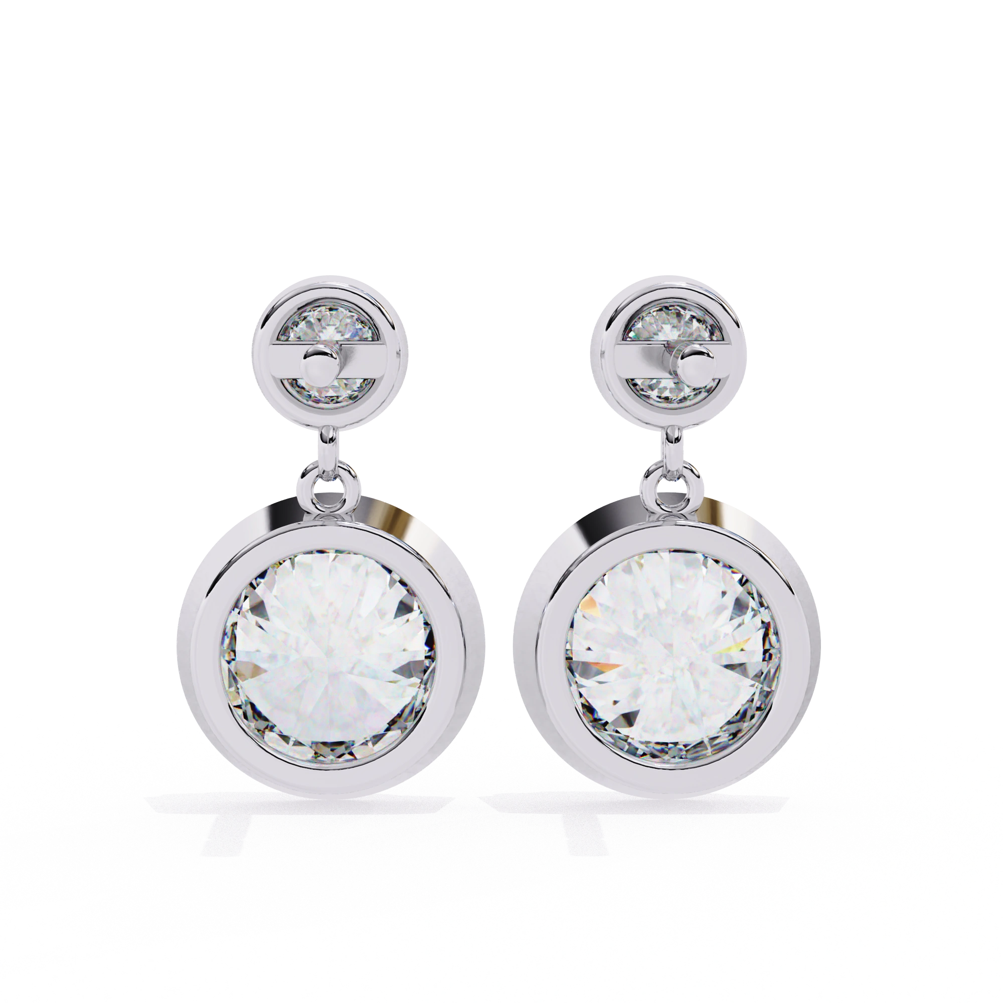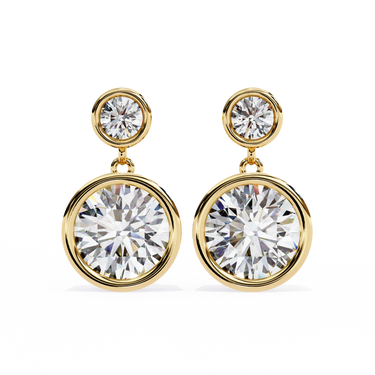 The 1.84 Carat Round Lab-Grown Diamond Bezel Drop Earrings In White Gold Mix Clean Lines And Bright Shine In A Simple Drop Style That Works For Daily Or Dressy Looks. Each Diamond Drop Earrings Holds A Round Diamond That Hangs Secure In A Bezel Edge Below The Post, Giving The Full Pair A Total Of 1.84 Carat With Solid Size That Catches Light Well Up Close Or Across A Room. The Bezel Setting Wraps Tight Around Each Stone For Protection While Letting Light Hit The Facets To Make Them Sparkle Strong Without Loose Prongs That Snag On Hair Or Clothes.​​