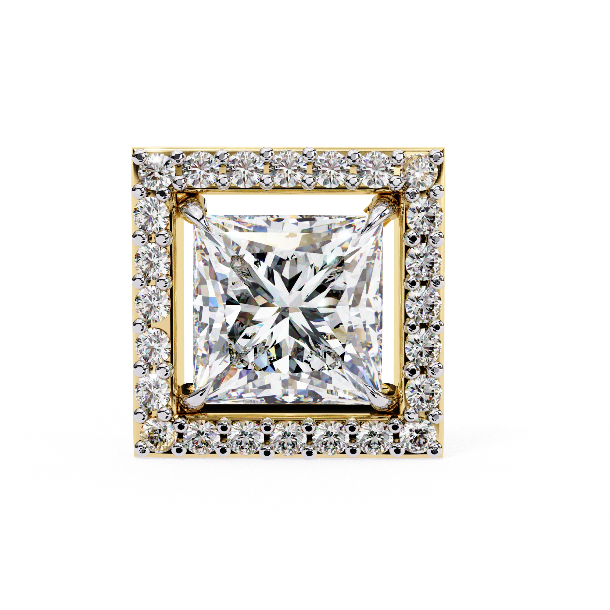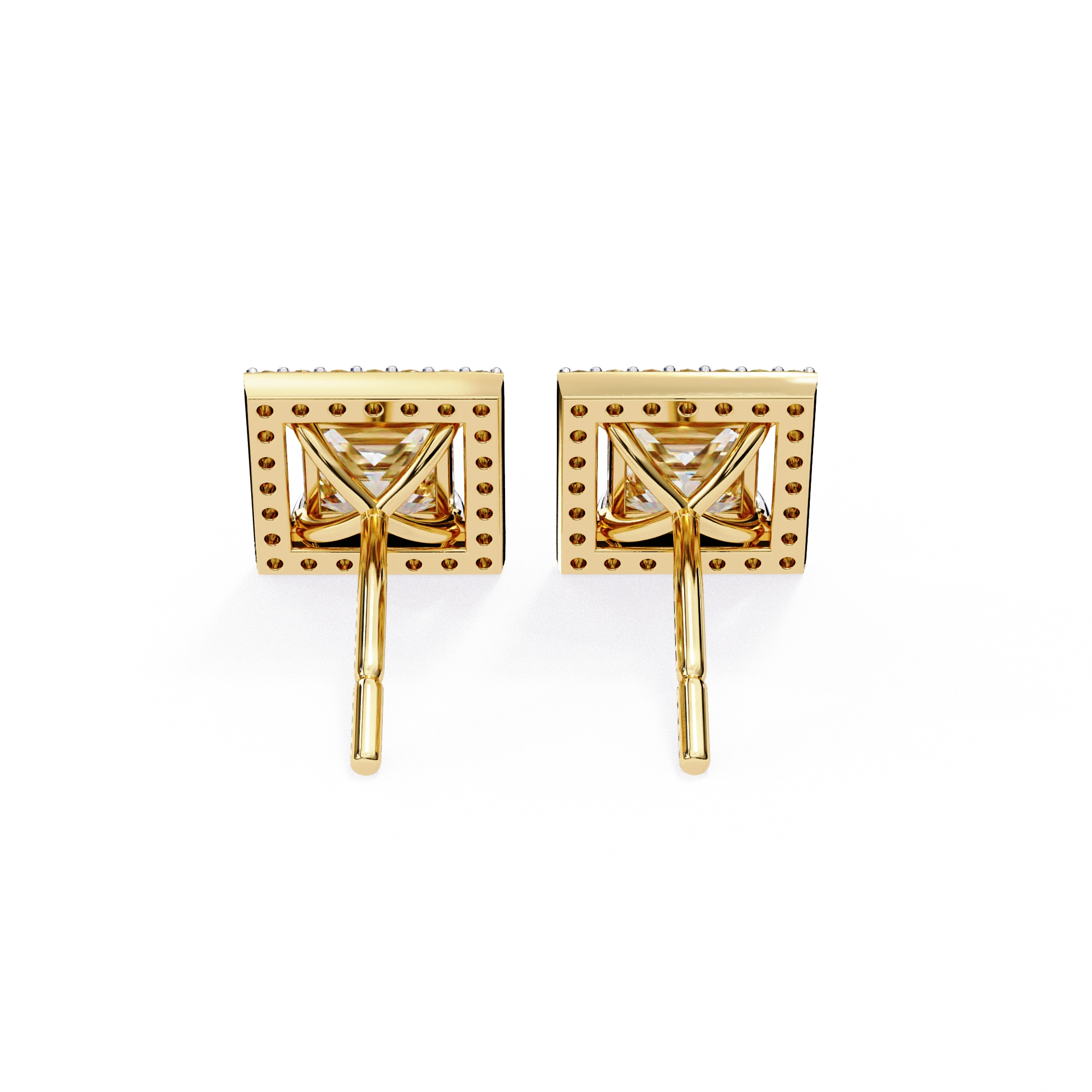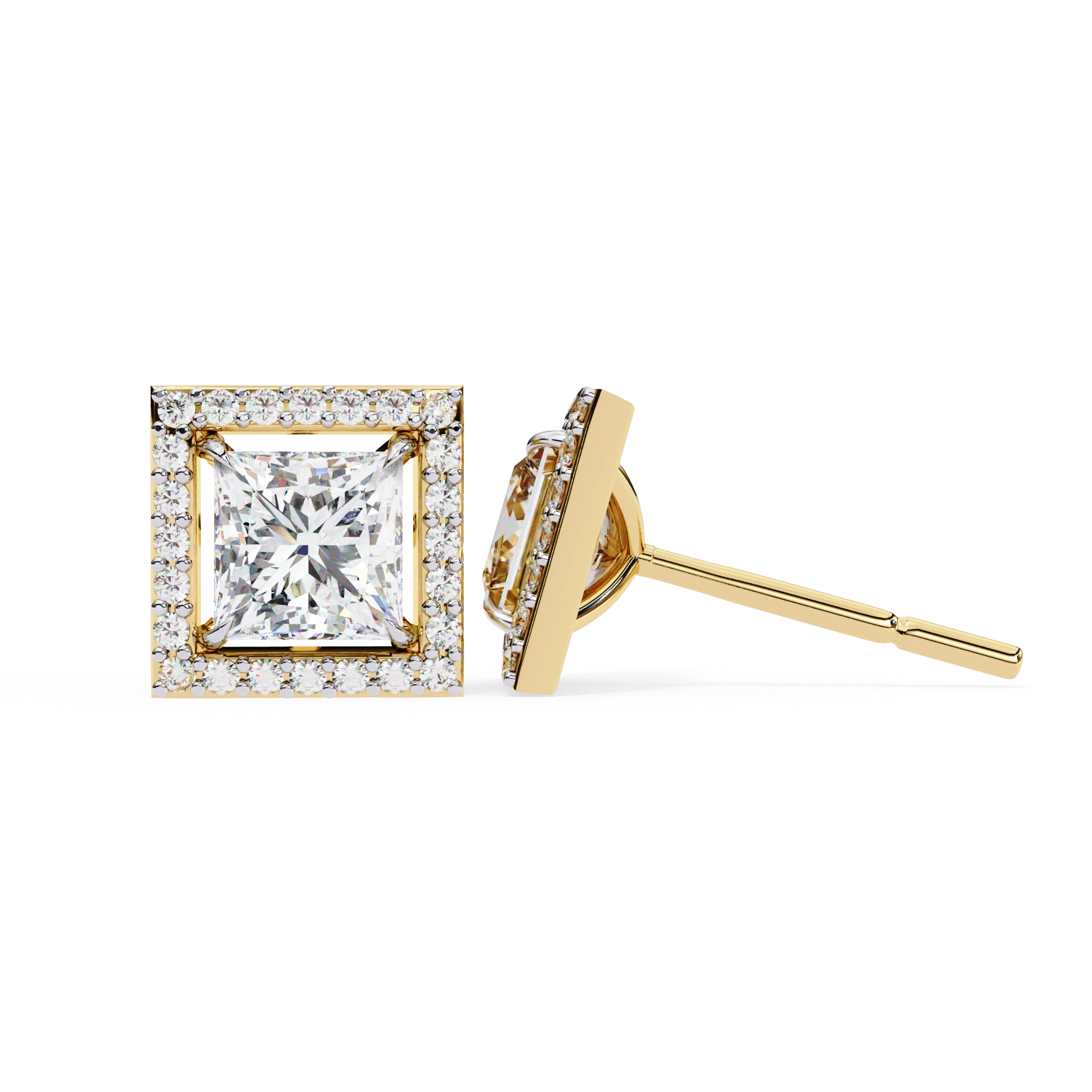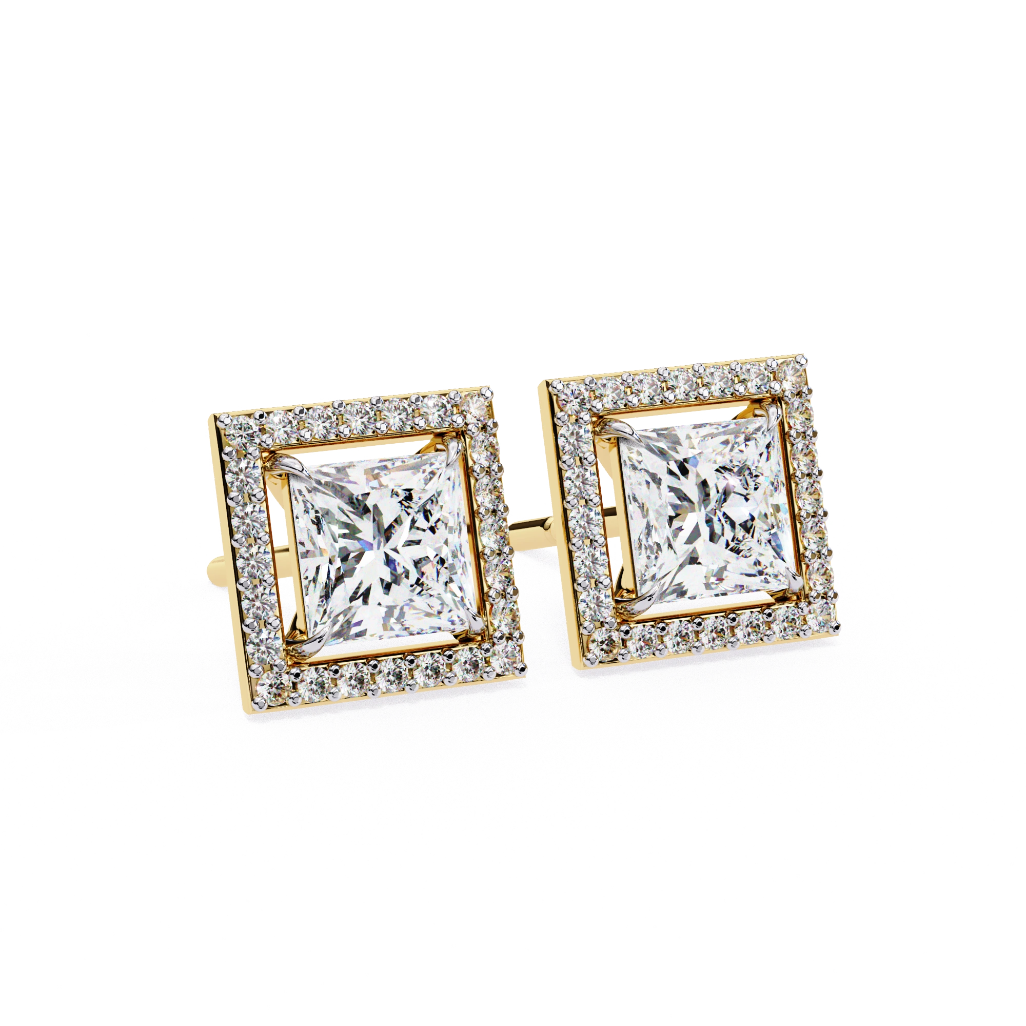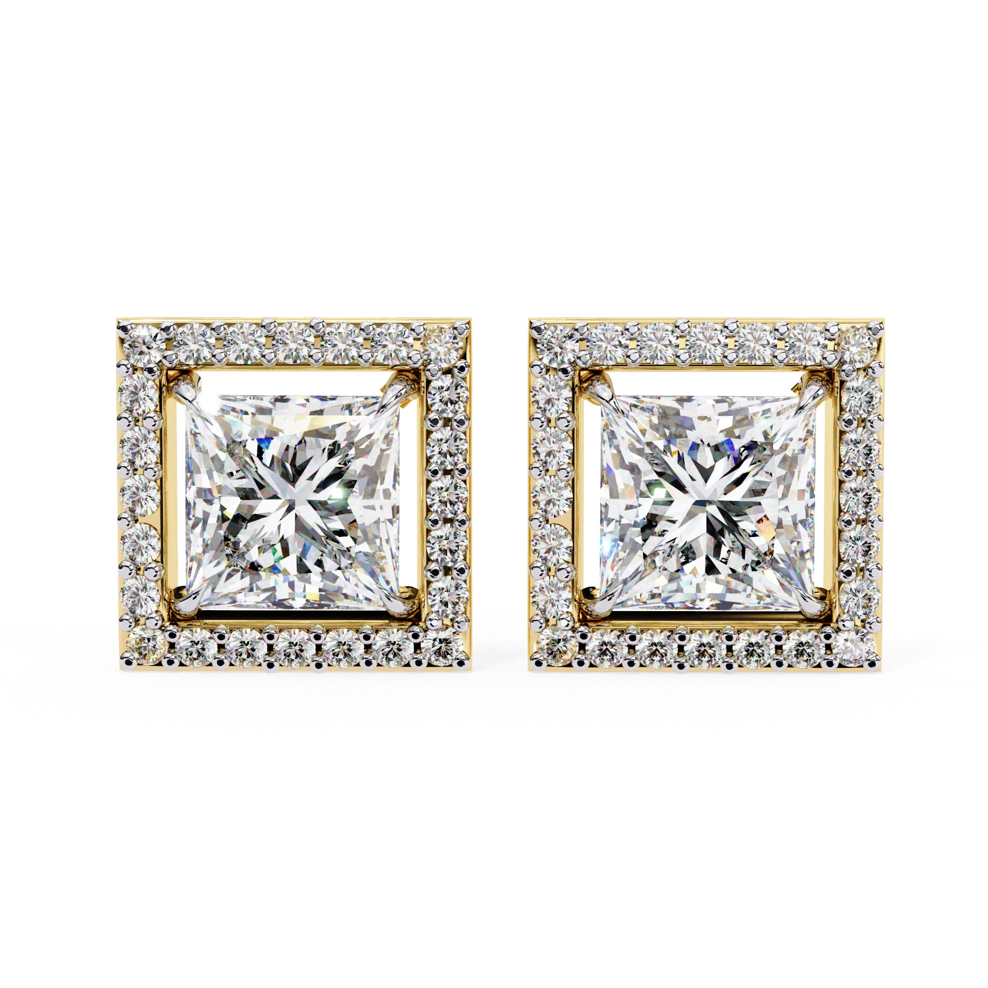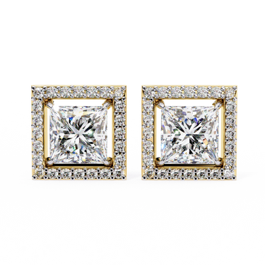 2.46 Carat Princess Cut Diamond Stud Earrings with Square Halo Design in Gold and Platinum